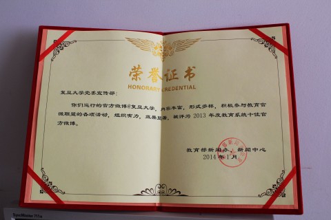 新闻中心讯 1月10日,教育部新闻办、新闻中心在天津大学召开教育系统微博微信工作推进会,表彰2013年度教育系统十佳官方微博及十佳官方微博提名奖。我校官方微博(@复旦大学 )与上海教育、华东理工大学、天津大学、武汉大学等10家单位官方微博获评“2013年度教育系统十佳官方微博”。