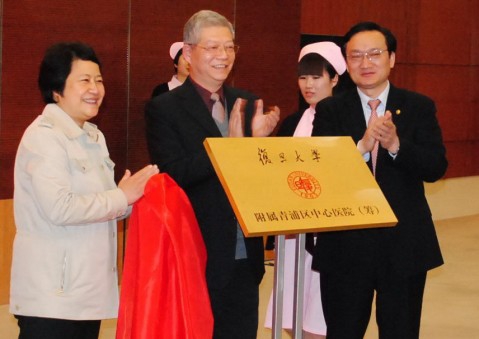 杨玉良、徐建光、赵惠琴共同为复旦大学附属青浦中心医院(筹)揭牌。