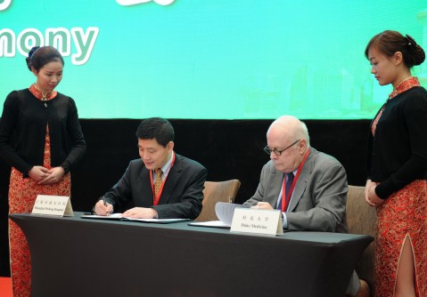 余波、Robert Tabert分别代表复旦大学附属浦东医院(筹)与杜克大学在合作办医协议上签字。