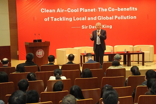 大卫·金爵士在演讲中展示了一系列数据,呼吁各国通过共同对话与协同合作解决全球污染问题。他指出,21世纪人类面临着能源安全、水污染、气候变化、生态破坏等一系列挑战,而气候变化正是人类迄今为止面临的最为严峻的考验。循环经济是我们解决发展与环境问题的唯一办法,此外,科技进步也能推动环境污染治理工作。演讲后,英国代表与复旦大学丁铎尔研究中心的教授们进行了讨论,并与到场学生互动交流。