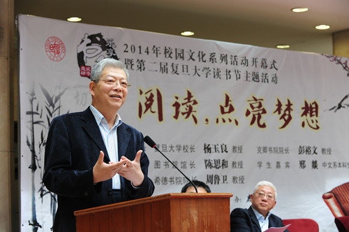 4月23日——“世界读书日”当天,2014年校园文化系列活动开幕式暨第二届复旦大学读书节主题活动在复旦大学图书馆举行。复旦学大学校长杨玉良、图书馆馆长陈思和、克卿书院院长彭裕文和读者代表邢燚同学围绕“阅读,点亮梦想”分别发表了演讲,向读者们分享了他们生活之中关于读书的点点滴滴以及他们的人生梦想。校党委副书记刘承功、校工会主席刘建中、希德书院院长周鲁卫等出席了活动。本次活动由校党委宣传部、校图书馆和复旦学院主办,鹿鸣书店协办。