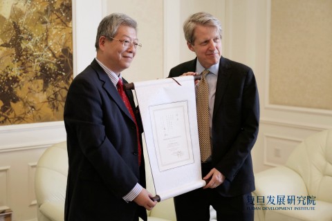 5月23日,在一年一度众人瞩目的“2014上海论坛”开幕前,2013年诺贝尔经济学奖得主Robert Shiller和彼得森国际经济研究所所长Adam Posen一同被聘为复旦发展研究院国际顾问委员会委员。受聘仪式由复旦大学校长杨玉良为Adam Posen和Robert Shiller颁发聘书,并向两位经济学家介绍了复旦大学的悠久历史和发展现状。另外,复旦大学副校长林尚立着重向两位经济学家介绍了复旦发展研究院的组织架构,国际合作和未来展望。