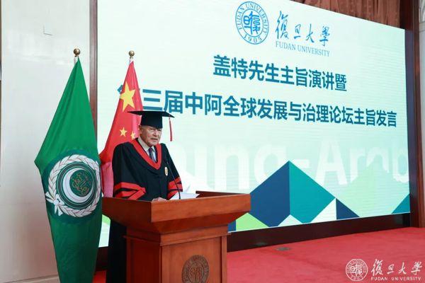 鉴于盖特在外交与全球治理领域的卓越成就,以及在推动阿盟秘书处与复旦大学开展创新性合作上的重要贡献,复旦大学学位评定委员会向国务院学位委员会提请为其授予名誉博士学位,并于今年7月获国务院学位委员会批准。