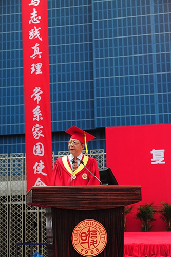 在全场师生的共同期待中,杨玉良校长发表了演讲,寄语全体毕业生,并向毕业生们提出了一个看似矛盾却十分值得思考的问题,即如何在受教育程度越高、知识越多的时候设法找回人类本应该有的天真。杨校长这样定义道,“这种人类的天真,是祖先们对大自然的有限索取,他们仅限于满足自己的生存,而没有其他非分贪欲;这种天真也是指祖先们每时每刻总归是扶老携幼,共赴生活的一种本分。只有天真的人,才会无穷无尽地去追问关于这个世界的基本道理,去探究关于自然、关于社会的造化。”