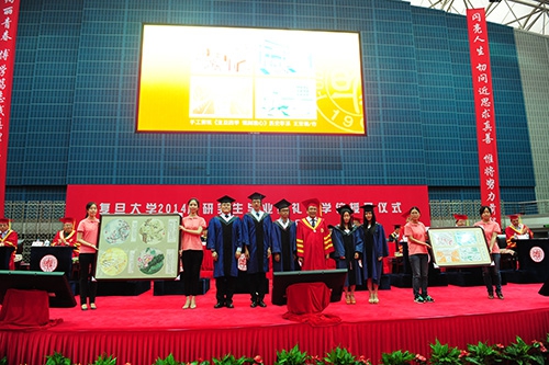 典礼上最感人的一幕,是2014届毕业研究生向母校献上了具有特殊意义的礼物。礼物由邯郸玉兰、张江荷花、江湾银杏、枫林梅花的组成,象征着学子们在复旦各个角落的时光。