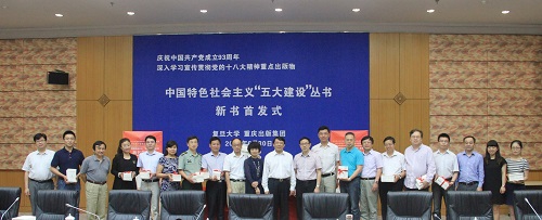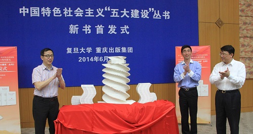新闻中心讯 6月30日,由复旦大学和重庆出版集团联袂打造的理论通俗读物《中国特色社会主义“五大建设”丛书》正式面世,并在沪举行新书首发式和赠书仪式,同时也启动了复旦大学社会主义核心价值观宣讲“进课堂,进社区,进企业,进军营,进网络”活动,为建党93周年献上一份厚礼。该丛书共11册,包括经济建设、政治建设、社会建设、文化建设、生态文明建设五个方面,被列为国家新闻出版广电总局深入学习宣传贯彻党的十八大精神重点出版物。