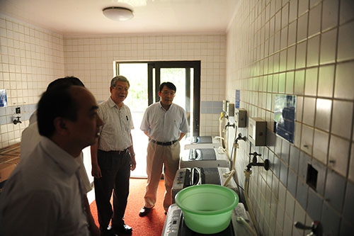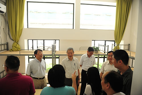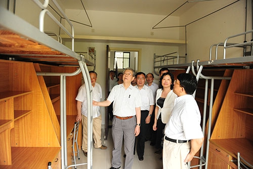 在江湾学生生活园区,校领导走进外立面整修一新的宿舍楼,仔细查看双人间和四人间的家具布置情况以及盥洗室洗衣间等配套设施;在汉庭酒店住宿点,校领导来到设置在一楼的学生阅览室、会议室等公用空间检查,逐一查看不同布局的房间,了解家具周转情况;在菁英汇公寓,校领导查看了位于一楼的四人间和不同房型的房间,现场听取了一位正在看房的同学有关安全防盗的建议。朱之文杨玉良等边看边问,对搬迁、安置、配套、安全等工作提出一系列具体要求。