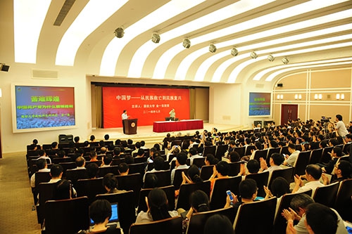 在两个小时的报告中,金一南教授以开阔的视野、珍贵的史料、生动的例证,以中华民族的百年救亡、百年复兴为主线,讲述了中国共产党从挫折走向胜利,中华民族从苦难走向辉煌的历程。金一南在报告中说,近代以来,中国的先进分子不断探索追求民族救亡的道路,但只有中国共产党完成了救中国的任务。毛泽东、周恩来、朱德等中国共产党人,他们身上都有一种极为珍贵的历史自觉。这种历史自觉,既包含了对历史运行规律的深刻领悟,更包含了对社会发展前景的主动营造。正是凭着这种历史自觉,中国共产党人艰苦卓绝、不怕牺牲、勇于奋斗,探索出一条符合中国实际的革命道路。历史是现实的一面镜子。今天,中国共产党要领导人民实现中华民族伟大复兴中国梦的历史任务,仍然需要这样的历史自觉,需要坚定的信仰和强大的精神家园,这是我们急需解决的问题。人民对美好生活的向往,就是我们的奋斗目标,也是支撑我们不断前行的动力。为人民服务,是中国共产党人永远的出发点和归宿。
