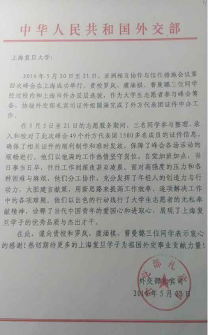 近日,外交部礼宾司致函我校,表扬国际关系与公共事务学院2010级本科生罗岚、虞涵棋、曹曼璐三位同学在担任亚信峰会志愿者期间的优秀表现。