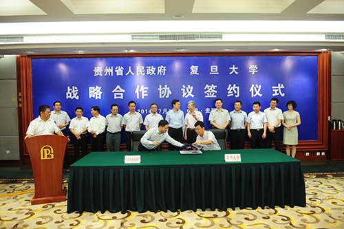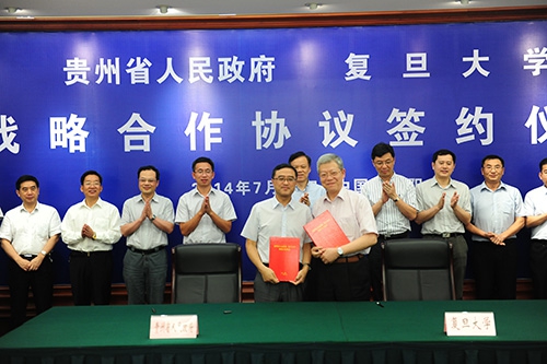 新闻中心讯 7月17日,我校与贵州省人民政府在贵阳市签订战略合作协议。贵州省委副书记、省长陈敏尔、校长杨玉良,贵州省副省长陈鸣明、贵阳市市长刘文新、校党委副书记刘承功等出席签约仪式。仪式上,校长杨玉良与贵州省副省长陈鸣明在战略合作协议上签字,党委副书记刘承功代表学校分别与贵阳市人民政府、贵安新区管委会、贵州省文明办签署合作备忘录。签约仪式由贵州省政府秘书长唐德智主持。