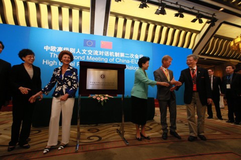 2014年9月6日下午,中欧高级别人文交流对话机制第二次会议在北京钓鱼台国宾馆芳菲苑大厅隆重举办。会议由中央政治局委员、国务院副总理刘延东与欧盟教育、文化、多语言和青年事务委员瓦西利乌共同主持。习近平主席和欧洲理事会主席范龙佩及欧盟委员会主席巴罗佐分布给中欧高级别人文交流对话机制第二次会议致以贺信。