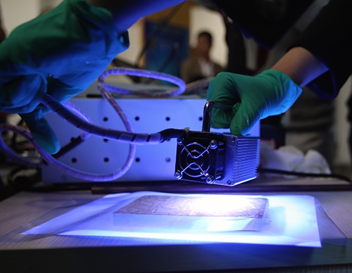 OLED即有机发光二极管,为区别于传统以无机化合物制成的二极管(LED)产品,在简称前加上字母“O”以作区分。OLED技术现已被广泛用于小型显示屏幕制造,较之LED,OLED技术更节能环保,屏幕可视角度更大、刷新频率更高,在图像质量、分辨率、色阶和节能等方面有着巨大优势。目前,各国企业与研发部门都致力于开发OLED大屏显示技术,如三星和LG推出的55寸OLED显示屏电视等。但由于高昂成本的局限,现仅停留在产品展示阶段,尚未进入量产。针对OLED应用的现状,区琼荣副教授的团队在OLED器件制备的工艺中引入等离子体表面处理技术,通过提高阳极ITO表面功函数以降低工作电压,从而提高了器件的工作效率,降低了部分成本。
