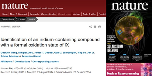 近日,复旦大学化学系周鸣飞教授科研团队在高氧化价态研究方面取得突破进展。相关研究论文IX价铱化合物的表征(“Identification of an iridium-containing compound with a formal oxidation state of IX”)于10月23日发表在国际顶级学术刊物《自然》(Nature)上。该项研究成果由复旦大学化学系的周鸣飞课题组联合德国柏林自由大学、清华大学以及加拿大麦克马斯特大学等单位的科学家共同完成,复旦大学化学系的王冠军副教授是本论文的第一作者。