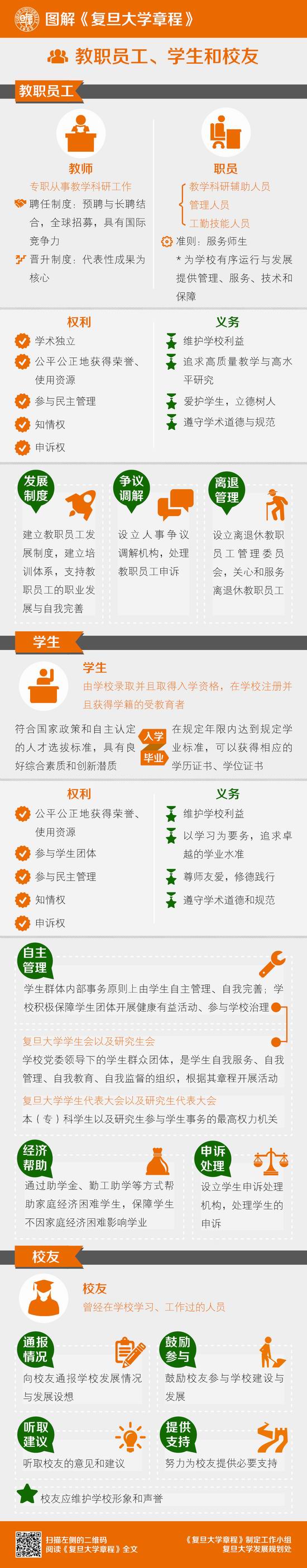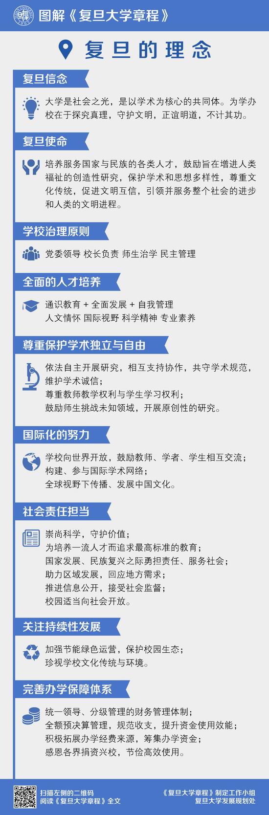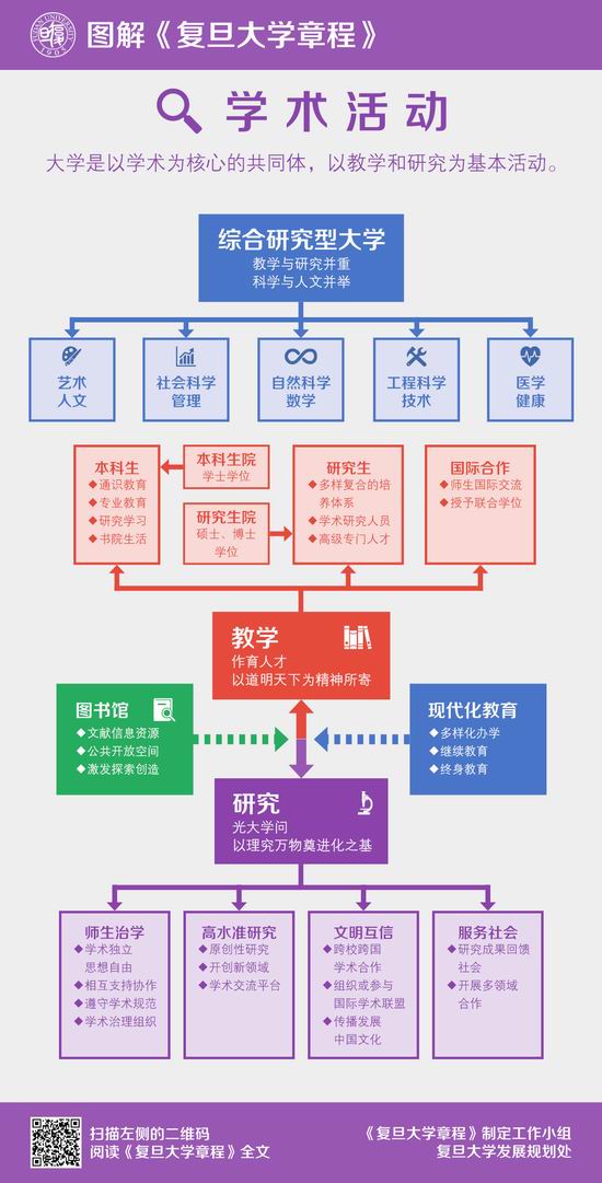 章程明确了“复旦信念”、“复旦使命”及“全面的人才培养”等多项核心原则。作为一所公立高校,在国家发展和民族复兴的时刻,尤为肩负重大使命。大学担负着人类文明和民族文化的积淀与传承,思想文化和学术的创造以及服务社会的任务。为学办校在于探究真理,守护文明,正谊明道,不计其功。章程中的学校使命围绕传承、创造、服务三个核心功能,结合学术孕育、知识传播、人才培养等内容展开。