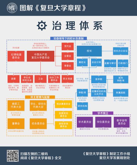 章程明确学校治理原则为:党委领导、校长负责、师生治学、民主管理。党委领导强调了坚持政治领导,校长负责明晰了校长责任界限,师生治学方面保持了学术组织独立性,民主管理方面适当提升了有关机构的作用。体系中还包括独立的审计与监督体系。章程在推进内部治理改革中形成,将改革成果制度化并充分吸收。尤其为两级管理体制改革及综合配套改革、教学教育改革定下基本、核心的原则,为后续改革留足空间。