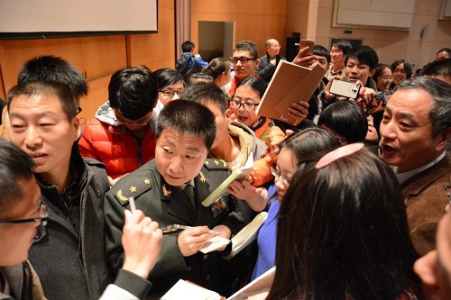 当晚的美国研究中心谢希德报告厅星光熠熠,杨将军结合自己投身中国载人航天事业的实践和感悟,给大家介绍了太空在国家战略中的重要性和我国目前航天事业发展情况,勉励同学们不忘使命担当,共同努力实现国泰民安、国富民强的中国梦强军梦。同学们认真听课、深受感动,并在提问互动环节热切积极提问。杨将军满怀激情、开放诚恳地回答了现场及全国二十几所高校学生在网络平台上提出的问题,气氛热烈,掌声不断,充满正能量。