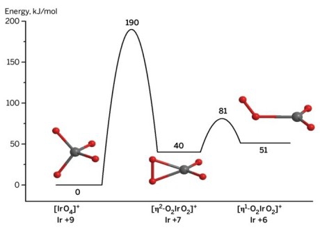 上图显示了不同价态的铱,分别检测到上述三个IrO4异构体能量,其中[IrO4]+(铱的+9氧化态(左))是最优异构体。