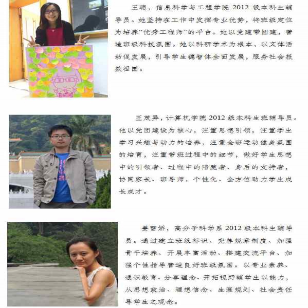 辅导员是帮助大学生健康成长的人生导师和知心朋友,也是学校宝贵的人才资源。复旦大学历来高度重视辅导员队伍建设,连续十一年举办“复旦大学本(专)科生十佳辅导员”评选活动,选树表彰了一批政治素质过硬、工作作风优良、深受学生爱戴的优秀辅导员,促进了队伍的交流和工作质量的提升,成为学校学生工作队伍建设的重要品牌。