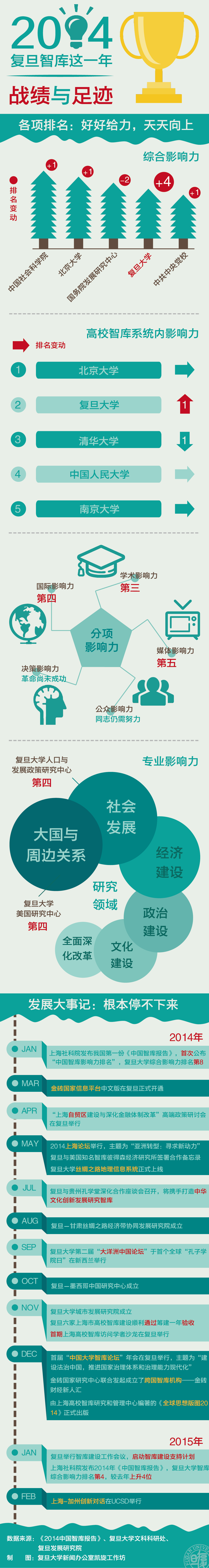 新闻中心讯 刚刚出炉的《2014年中国智库报告》公布了2014年中国智库排行榜,复旦智库综合影响力从去年的第八位跃居第四位,在全国高校智库中排名第二。这份由上海社会科学院发布的国内首个较为权威的智库排名,彰显着复旦智库建设着眼大局、凝聚力量,改革创新、顺势而为的决心和行动。