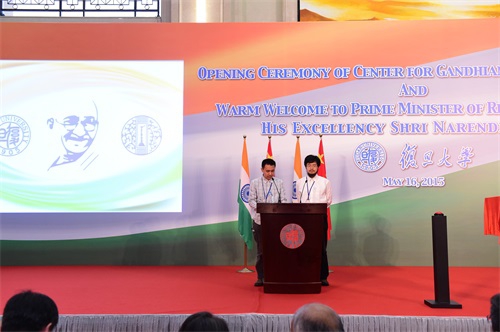 在甘地和印度研究中心揭牌仪式上,主持人冯晓源副校长介绍了该中心的负责人和研究人员,两名复旦学生用梵文朗诵印度史诗《摩诃婆罗多》。随后,许宁生校长在致辞中对莫迪总统一行到访表示热烈欢迎。他指出,复旦大学在中印两国人文交流中起到了积极促进作用,复旦有关印度的研究与合作可以追溯到上个世纪,而目前正在进行的丝绸之路、西域、玄奘取经之路等的综合研究与印度密切相关。许宁生表示,学校将整合资源,与ICCR等机构、高校密切合作,力争把中心建设成国内研究印度历史、社会、经济、文化和甘地思想的重要基地和交流平台,期望通过学术科研活动,推进两国相互了解共同合作。