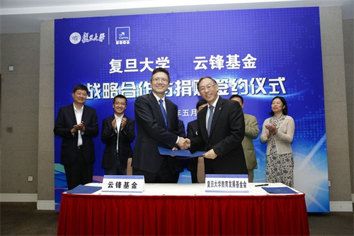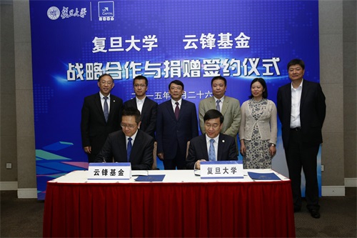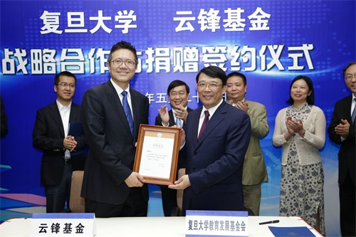 新闻中心讯 5月26日下午,时逢复旦大学110周年校庆之际,复旦大学-云锋基金战略合作暨捐赠签约仪式在复旦大学光华楼东辅楼101室举行。复旦大学党委书记朱之文,复旦大学校长许宁生,哲学学院86届哲学本科、91届哲学硕士,云锋基金创始人、主席虞锋先生,管理学院97届会计本科、云锋基金董事总经理黄鑫先生,经济学院92届人口所硕士,云锋基金董事总经理朱艺恺先生等嘉宾以及70余名复旦师生、校友共同出席了仪式。仪式由复旦大学生命科学学院党委书记陈浩明主持。