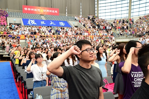 校歌响起,在主席台前排就座的校领导和老师亲切地为新生代表佩戴上校徽。这一枚枚小小的校徽将在场所有研究生联系在一起,从此他们就有了一个新的名字——复旦人。全体新生在研究生会主席顾皓卿的带领下郑重宣誓:“胸怀远大理想,关注人类命运,忠于祖国,热爱人民,探求真知,追求卓越,勤学励行,勇于创新,遵纪守法,文明诚信,弘扬复旦精神,恪守学术道德,为母校争光添彩,为国家贡献力量!”