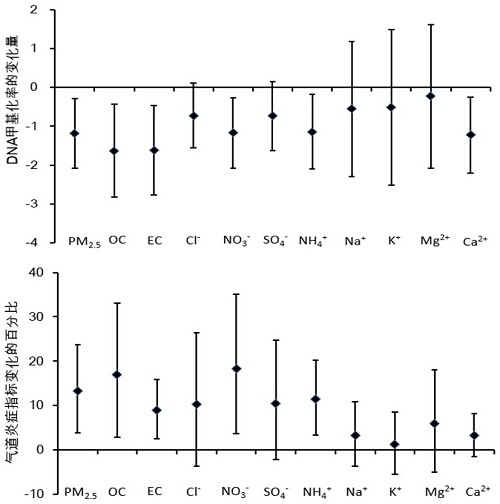 据论文第一作者陈仁杰老师介绍,表观遗传是指DNA序列等遗传信息不发生变化,但基因表达过程却发生了改变,从而影响基因的功能。以DNA甲基化为代表的表观遗传异常是目前国际上环境与健康研究的新兴热点领域之一。课题组以上海市某社区的一组慢性阻塞性肺病患者为研究对象,实时监测了PM2.5及其组分的暴露水平,并同时检测了病人的呼吸道炎症指标和相关编码基因NOS2A的DNA甲基化水平。结果显示,PM2.5可先通过引起NOS2A的DNA甲基化水平降低,然后导致呼吸道炎症指标水平增加;PM2.5中主要是有机碳、元素碳、硝酸盐和铵盐成分发挥作用。