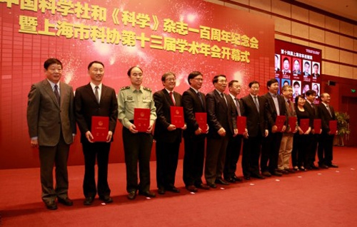 10月21日下午,中国科学社和《科学》杂志一百周年纪念会暨上海市科协第十三届学术年会开幕式于上海市科学会堂隆重召开。本次会议由中共上海市委宣传部、上海市科学技术协会、《科学》杂志编委会主办。中国科学院院长、《科学》杂志编委会主编白春礼院士,中共上海市委副书记应勇,中共上海市委常委、上海市副市长艾宝俊,上海市科协主席陈凯先院士等出席本次会议。陈凯先院士主持会议,并宣读了第十四届上海市科技精英奖及提名奖获奖名单。我校附属眼耳鼻喉科医院孙兴怀教授荣获第十四届上海市科技精英奖,艾宝俊副市长在会上为其颁发了获奖证书。我校数学科学学院周忆教授、基础医学院宋志坚教授获提名奖。
