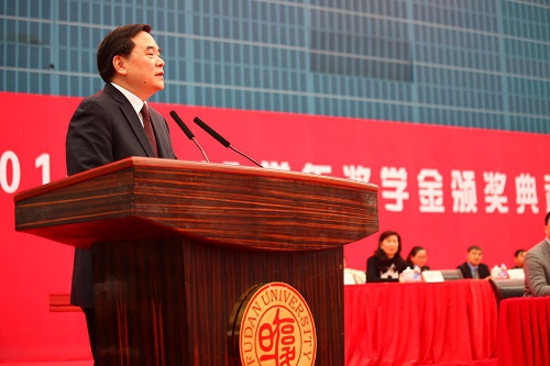典礼最后,常务副校长包信和院士发表了热情洋溢的讲话,向获奖学生表示祝贺,并感谢社会各界对复旦大学的支持。他指出,奖学金的评奖原则,就是学校人才培养方针的集中展现。他代表学校向复旦学生提出四点希望:希望同学们勤于学习,利用好人生中这段宝贵时光,踏踏实实地学知识,长本领,不断丰富和完善自己;希望同学们善于思考,掌握科学精神和思维方法,着力培养自己发现问题、解决问题的能力;希望同学们勇于创新,面对创新创业的浪潮,敢于突破,敢于超越,敢为人先,努力成为创新的弄潮儿,创业的践行者;希望同学们始终保持远大的理想,把个人发展和国家民族的前途命运结合起来,为寻找真理而学,为社会进步而学,为家国责任而学。他勉励同学们勤学好问、求真务实、心怀家国、牢记使命,在中华民族伟大复兴的历史进程中谱写属于自己的壮丽篇章。