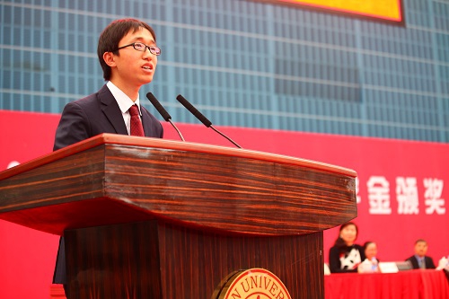 国家奖学金获得者、高分子科学系2011级直博生冯凯作为获奖学生代表发言。在发言中,冯凯回顾自己的科研成长道路,感谢学校创造的浓厚学术氛围和导师无微不至的关怀,并总结出三点经验:要勇于大胆尝试并承受压力、勇于并善于创新、乐于沟通并善于沟通。在校训引领下,冯凯不仅在科研学术和学生工作中取得了傲人的成绩,即将毕业的他毅然作出了回到江苏老家与同学一起创业的选择,他希望能学有所用,研发出属于中国人自己的新一代覆铜板材料。他还勉励处在学习、科研起步阶段的学弟学妹们,珍惜现在的时光,明确自己肩负的责任,用复旦精神鞭策自己,为国家强大、为民族振兴作出自己的贡献。