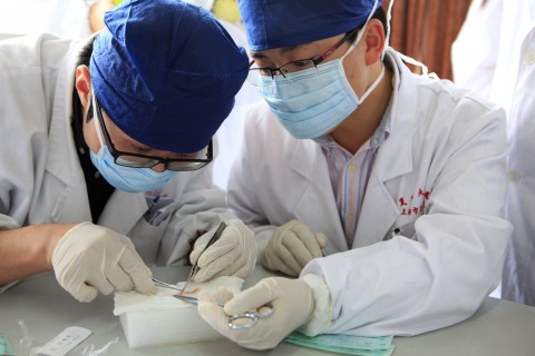 图为市五医院“科教文化周”期间外科业务骨干进行血管吻合“比武”