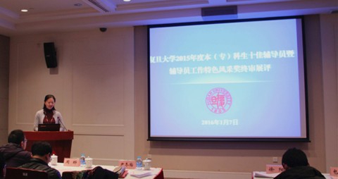 2015年1月7日,复旦大学2015年度本(专)科生十佳辅导员暨辅导员工作特色风采奖展评在光华东辅楼103会议室举行。校党委副书记尹冬梅及学校有关职能部处负责老师出席并担任评委,各学院学生工作首要负责人、学工组长、辅导员和人才工程(一期)22批队员等也到场进行了观摩和学习。