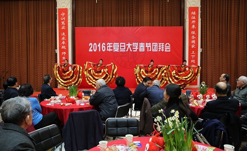 团拜会上,校领导同大家亲切握手,互致新春祝福。复旦师生表演了精彩的文艺节目,赢得观众们阵阵掌声。