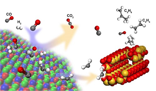 传统的费-托(F-T)过程采用金属(还原态)作催化剂。CO分子在金属催化剂表面被活化解离成C原子和O原子,C原子和O原子与吸附在催化剂表面的氢发生反应,形成亚甲基(CH2)中间体,同时放出水分子。亚甲基中间体通过迁移插入反应,在催化剂表面进行自由聚合,生成含不同碳原子数(从一到三十,有时甚至到上百个碳原子)的烃类产物。整个反应烃类产物碳原子数分布广,目标产物的选择性低。同时,这一过程需要消耗大量氢气来移去金属催化剂表面CO解离生成的O原子,而这些宝贵的氢气是通过水煤气变换(CO+H2OH2+CO2)获得的,水煤气变换过程是一个高能耗的过程,还要释放出大量CO2。大连化物所研究人员创制的过程采用部分还原的复合氧化物作催化剂,CO分子在催化剂氧缺陷位上吸附并解离,气相氢分子选择性地与解离生成的C原子反应生成亚甲基自由基,而催化剂表面CO解离生成的氧原子倾向于与另一个CO反应,形成CO2。与传统的F-T过程不同,在氧缺陷位产生的亚甲基自由基,不在催化剂表面停留或发生表面聚合反应,而是迅速进入分子筛孔道,在孔道限域环境中进行择形偶联反应,定向生成低碳烯烃,大大提高了产物的选择性。通过对分子筛孔道和酸性质的调控,可以实现产物分子的可控调变。