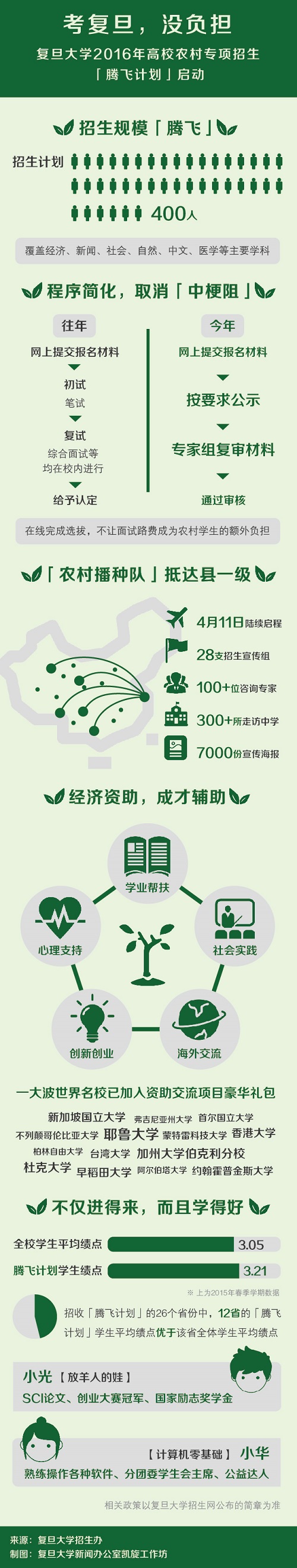 在我校公布的2016年“腾飞计划”简章中,“体验营”等需要考生亲赴学校参加的测试不见了踪影,“中梗阻”全部取消。考生们无需再因各类笔试、面试要求远赴异地,承担出行成本。这一为农村考生量身打造的“绿色通道”,将他们通往复旦之路变得不再“折腾”。