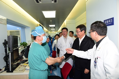 在附属中山医院,魏小鹏一行实地调研了急诊抢救室、心导管介入中心、第46病区等,与病人家属进行交流,就医疗、教学、科研、管理、交流合作等方面情况与医院领导班子进行座谈。他表示,中山医院建院近80年来,大力弘扬服务社会的奉献精神,以严谨的医疗作风、精湛的医疗技术和科学的内部管理,在学科建设、科学研究、人才培养、服务社会等各方面发展成绩卓著。下一步,中山医院要牢牢把握“十三五”发展契机,在原有的良好基础上,进一步凝练方向,汇聚人才,推动学科交叉融合与优势资源集聚,提升大平台、大基地、大项目建设水平,使医院各项事业再上新台阶;要深化中央专项巡视整改工作,进一步加强医院管理,做好重点领域与风险环节防控,配置好各类医疗资源。同时,要着力完善内部治理体系,优化各类考核指标,做到医院治理与运行的科学化、制度化、规范化;要高度重视基层党建工作,认真开展“两学一做”学习教育,精心筹备医院第二届党代会,抓好班子建设、党员学习、基层组织建设等各项工作,为医教研各项事业发展提供坚强保障。