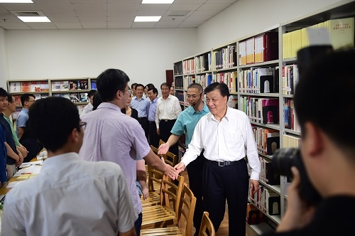 新闻中心讯 6月19日下午,中共中央政治局常委、中央书记处书记刘云山到我校调研。中共中央政治局委员、中宣部部长刘奇葆,中共中央政治局委员、上海市委书记韩正参加调研活动。校党委书记魏小鹏、校长许宁生等陪同调研。