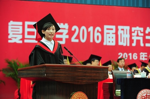 药学院2011级直博生安赛同学代表全体毕业生发言。她从自身的学习经历出发,阐述了对复旦精神的认识。她表示,复旦精神不仅是一种敢于有梦、为梦坚持的信念,更是为国家和社会贡献力量的使命感和责任感。