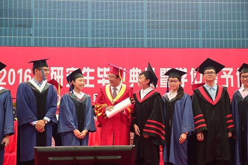 在庄严和神圣的学位授予仪式环节,副校长桂永浩宣读复旦大学学位委员会公告,研究生院院长钟扬教授主持学位授予仪式。在场的博士生和硕士生在与会师生和家属的见证下接受了导师们的拨穗,为自己过去几年的研究生学习画上了圆满的句号。最后,在全场洪亮齐唱的校歌声中,2016届研究生毕业典礼暨学位授予仪式落下了帷幕。