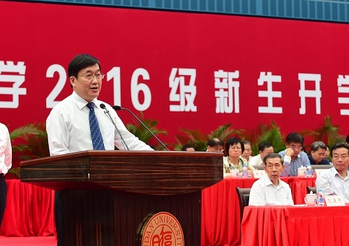 最后,校长许宁生发表讲话,对2016级新生表示祝贺和欢迎。他鼓励同学们尽快发现自己,打造未来,通过通识教育、书院生活、创新创业和实践教育等复旦的平台成长为具有“人文情怀、科学精神、专业素养、国际视野”的领袖人才和各行各业的栋梁之才。他希望同学们首先要有“复旦魂”,铭记并践行复旦校训,秉持复旦“学术为魂”的办学理念,为真理而不计名利,要学习“团结服务牺牲”的复旦精神,为中华民族、各自的民族和人类文明事业的进步而努力;其次要完善和提升自己的核心价值观;最后要在复旦创建世界一流大学的进程中严格要求自己,担当起复旦人的共同使命,跟上复旦的加速度,和学校一起努力奋斗、砥砺前行。