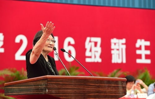 中国工程院院士、本(专)科生“我心目中的好老师”、基础医学院教授闻玉梅作为教师代表发言。闻玉梅首先代表全体教师欢迎2016级新生入校。她鼓励新生要汲取营养、努力创造,要做“蜜蜂”,向外探索、广泛采集、吸收转化、予人甘甜;她勉励新生要学习好基础知识,做好基本功的积累,要成为参天大树,扎根大地、永远向上、不畏风雨、造福后人;她希望同学们要有一颗健康的心,做到有爱心、有恒心、有公心,爱国爱民、持之以恒、为人着想,成为身心健康的人。最后,闻老师以自己求学和工作的经历,鼓励全体新生同学,在国家建设十三五和实现全面小康社会的关键时刻,勇担重任,以国际的视野,广交朋友,进一步了解世界,也让世界进一步了解中国。
