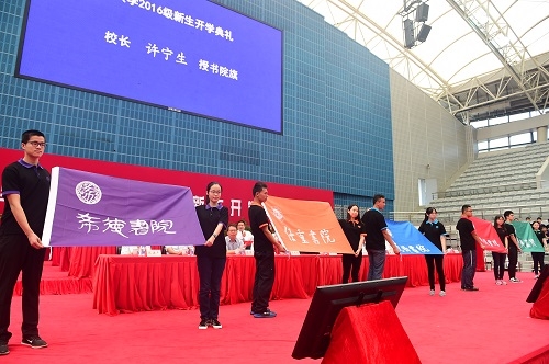 同学们将在志德、腾飞、克卿、任重、希德五大书院里共同学习、生活。新生代表向全体观众展示各自书院的文化标识和旗帜。