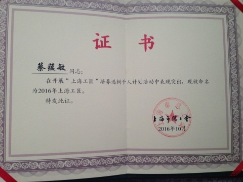 10月27日下午,在“上海工匠”培养选树计划推进会上,2016年“上海工匠”评选结果揭晓,88名首批上海工匠正式诞生,复旦大学附属蔡蕴敏荣获首批“上海工匠”称号,同时荣获“上海市五一劳动奖章”称号。