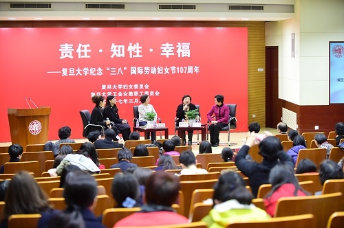 纪念大会后举行了“责任·知性·幸福”主题论坛,上海市“三八红旗手标兵”雷群英,上海市“三八红旗手标兵”、全国五一巾帼标兵曾璇,上海市巾帼创新奖获得者耿道颖,上海市“三八红旗手标兵”黄丽华等四位优秀女性代表,在马克思主义学院教师陈果的主持下围绕主题进行了探讨和分享。