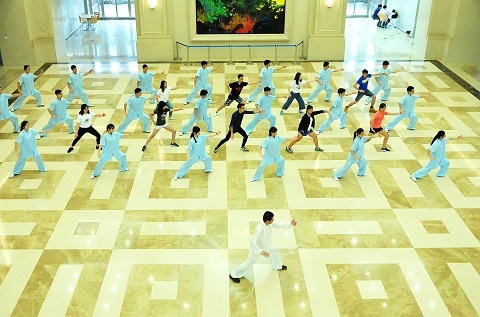 在旦苑食堂品尝了富有上海特色的早餐后,参访团一行来到光华楼,同复旦师生一起练习太极拳,并聆听复旦学子解读太极的中国哲学意蕴。