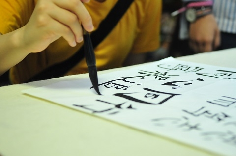 随后,参访团来到任重书院经典研读书屋,与正在练习书法的复旦学子交流,并在折扇上书写“寻根追梦 同心同行”。