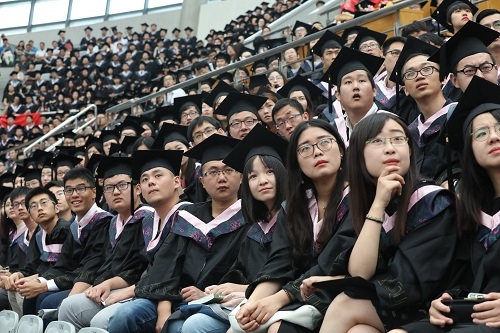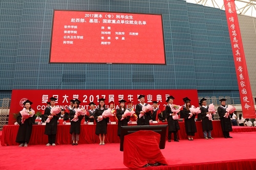 近年来,复旦大学去西部、基层和国家重点单位就业的毕业生不断增多。典礼现场,主席台嘉宾向赴西部、基层、国家重点单位就业的学生代表赠送鲜花。