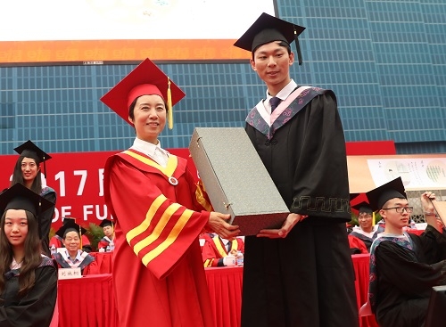 这份礼物的创作团队涵盖文、理、医、工四大类学科毕业生,是全体毕业生创意与智慧的结晶,根据各院系毕业生提供的素材,由化学系毕业生方方创作绘画,附属中山医院毕业生傅正主笔书法,中国语言文学系的孙时雨设计题词。骊歌声渐起,卷轴徐徐展开,构成一条主线,贯穿了2017届毕业生在复旦的美好时光。焦扬代表学校接受这份满载着隽永深情的礼物。