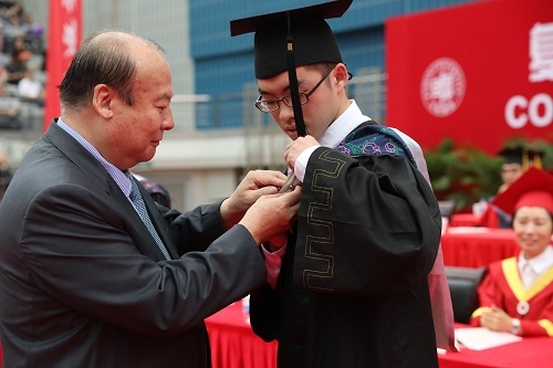 毕业生也是复旦最年轻的校友,不管未来身处何方,都带着母校的殷切期望和亲切祝福。临别之际,复旦大学也为毕业生们准备了礼物“相辉校友章”。复旦大学校友、校董,全国政协常委,中国泛海控股集团董事长、总裁卢志强为毕业生代表佩戴,见证着毕业生们从学生到校友身份的转换。