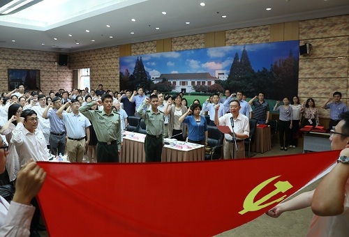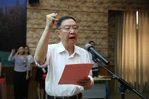 中国科学院院士、数学科学学院教授李大潜带领新入党师生党员代表面向党旗庄严宣誓,在场全体党员一起重温了入党誓词。会议表彰了复旦大学年度十佳党支部书记、优秀教职工支部书记和优秀党建课题成果。